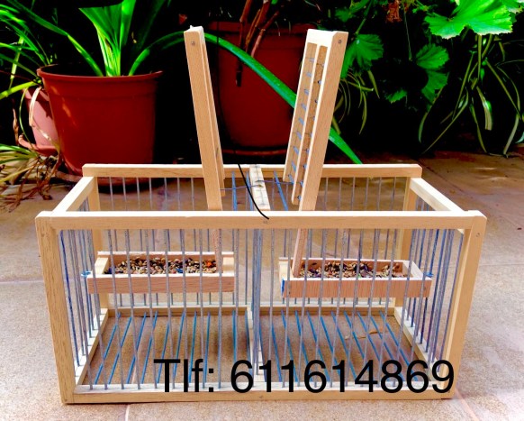 Jaula con dos trampas a los lados grandes y zona para el reclamo, bandeja de aluminio extraible, madera de haya